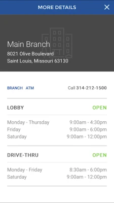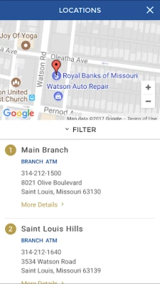 Har du brug for at finde en pengeautomat eller en filial? Royal Banks of Missouri's app udnytter din enheds GPS til øjeblikkelig adgang og rutevejledning til de nærmeste lokationer. Med et enkelt tryk kan du også etablere direkte telefonisk kontakt til os, hvilket sikrer, at hjælpen altid er nær, når du har brug for det.